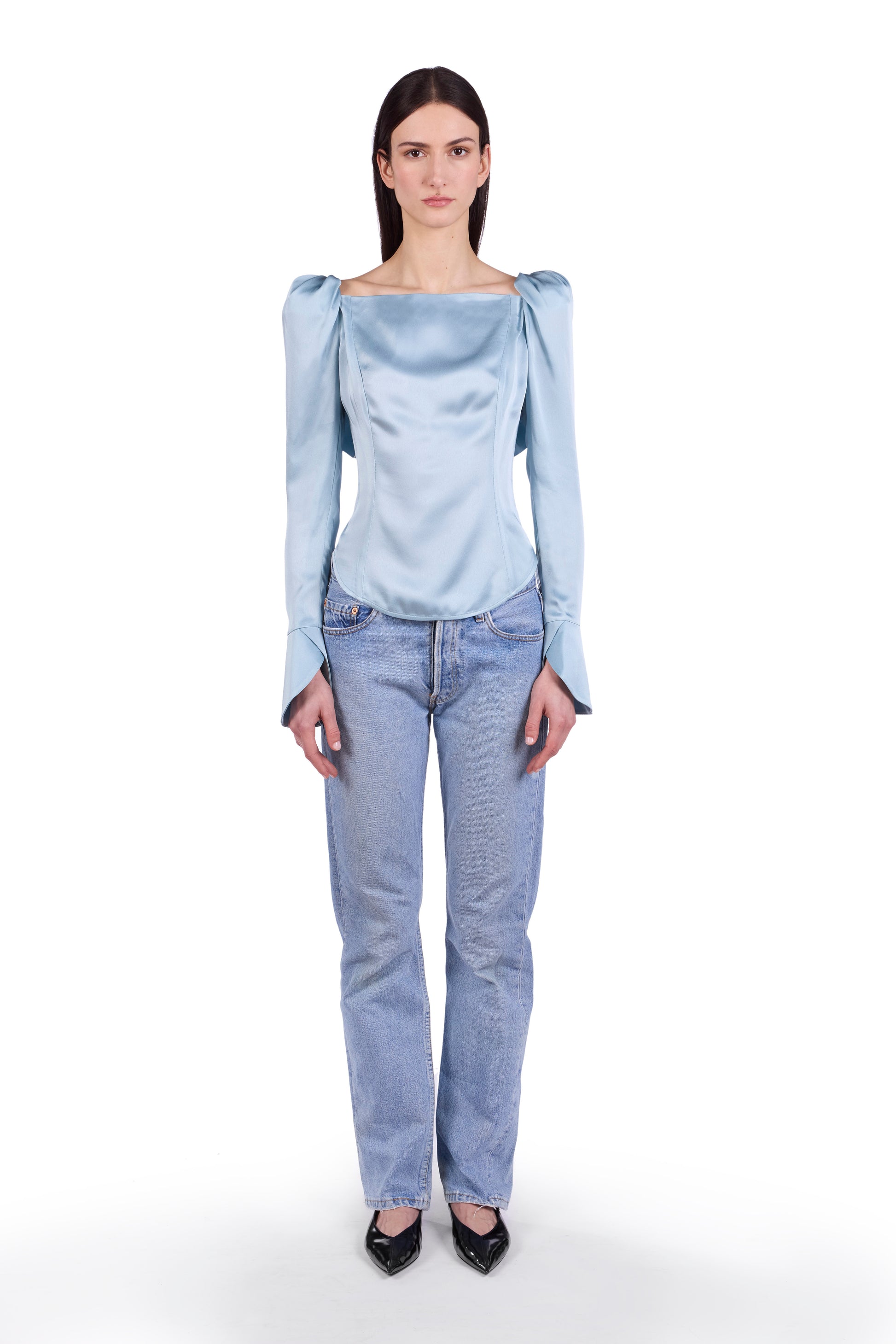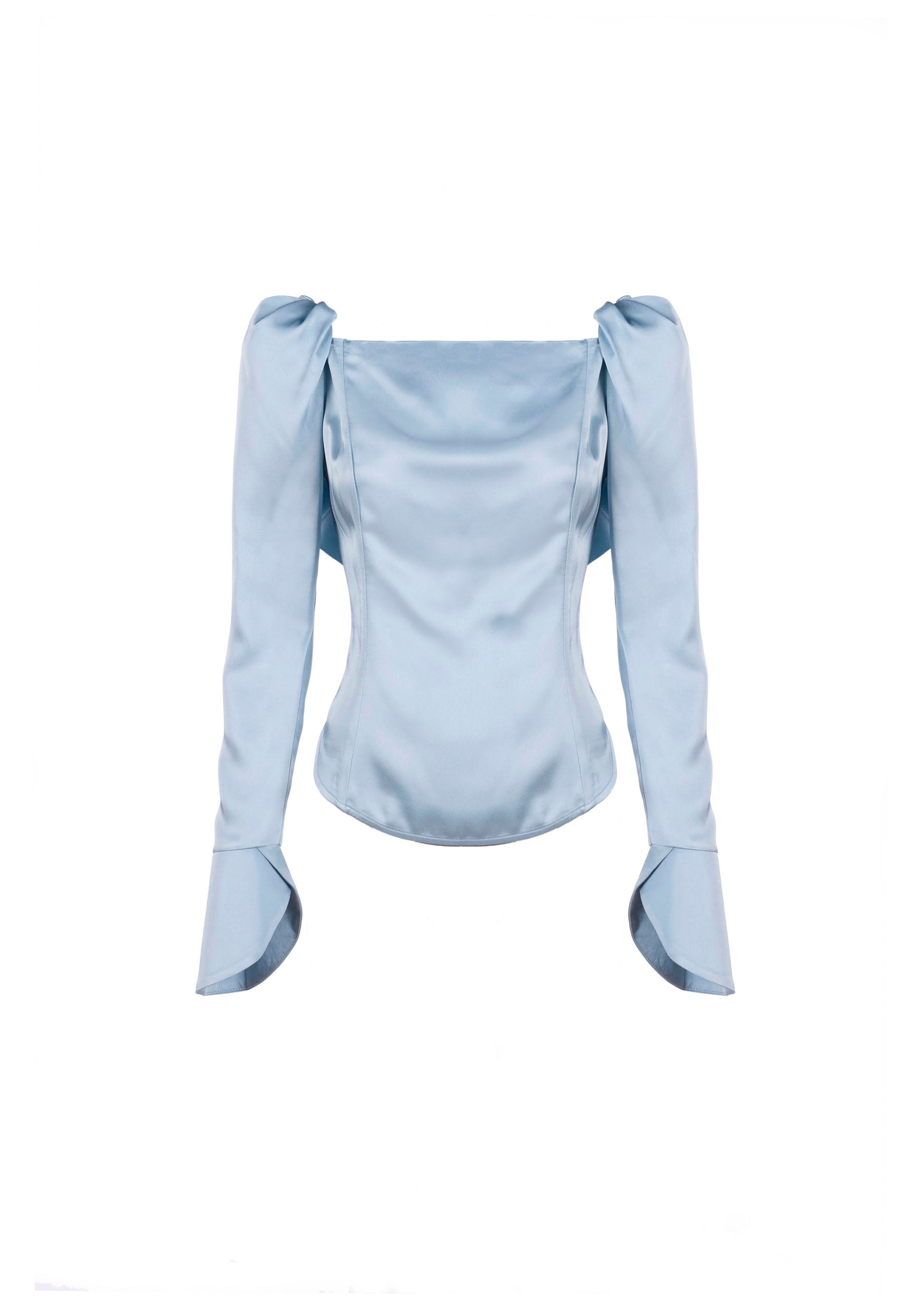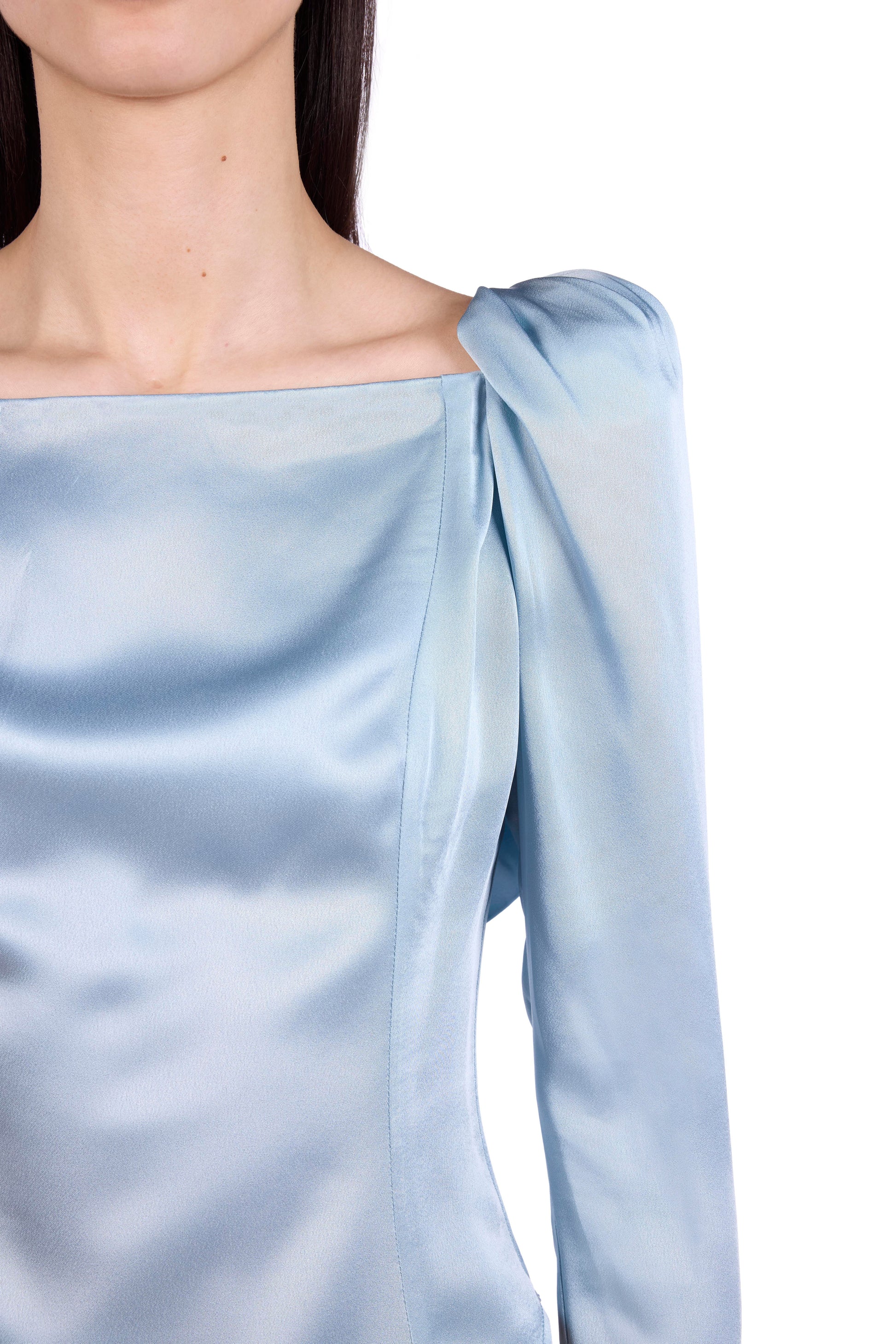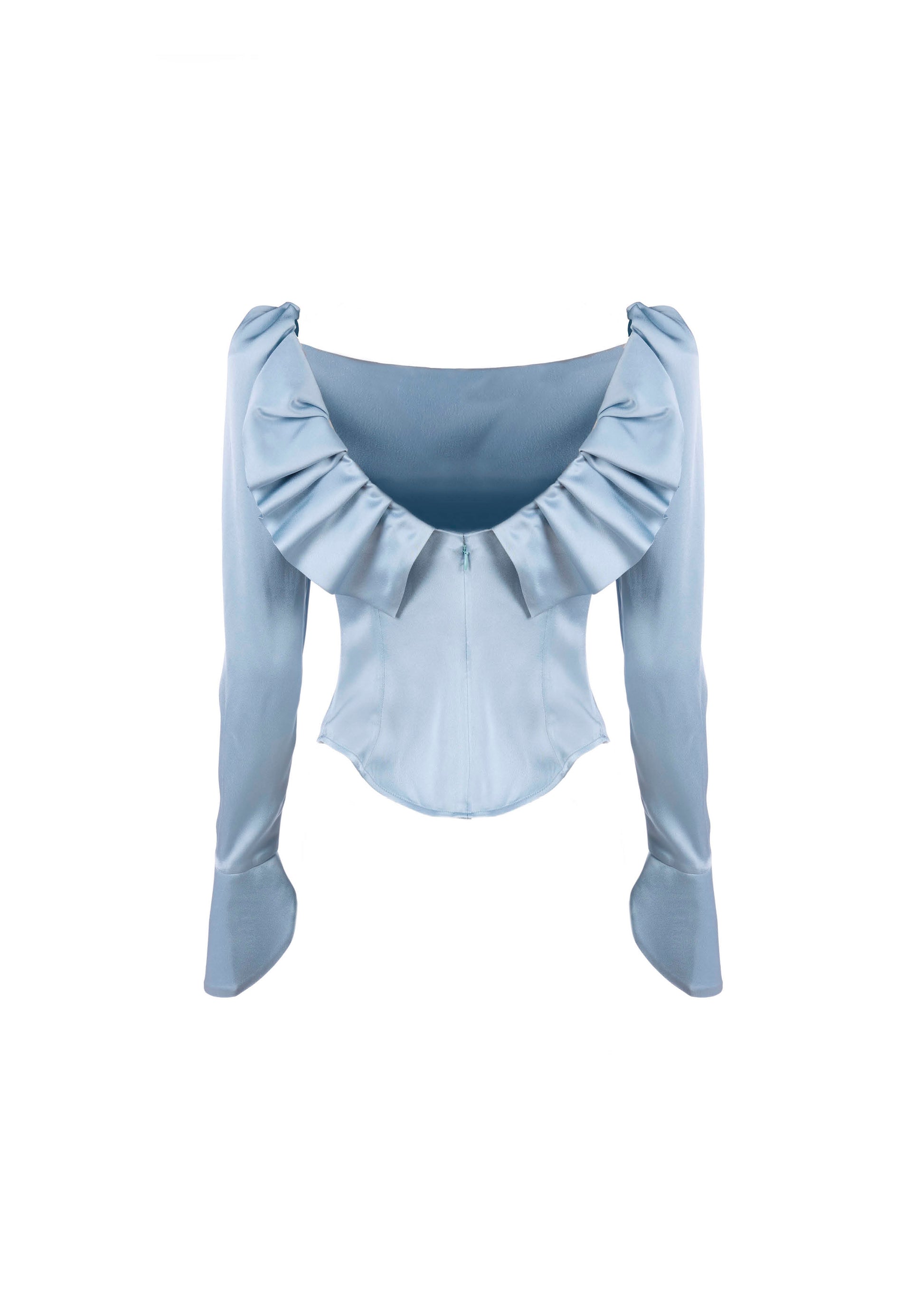 Satin top with puffed shoulders and low back with ruffle detail. Center back invisible zip closure.